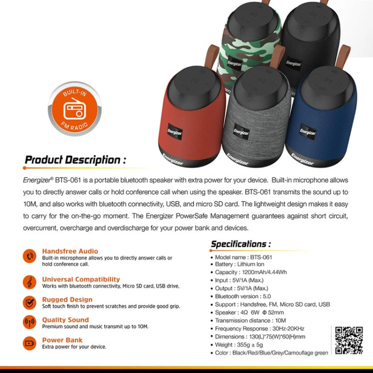 اسپیکر بلوتوثی BTS061 انرجایزر از رادیو FM پشتیبانی میکند. شما با کمک کلیدهای موجود روی اسپیکر میتوانید به جستجوی کانالهای موردنظر خود بپردازید. همچنین این اسپیکر علاوه بر بلوتوث و رادیو از فلش مموری و کارت میکرو نیز پشتیبانی میکند. به کمک دکمه M بر روی اسپیکر میتوانید مود اسپیکر را تغیر دهید. دکمه وسط دکمه خاموش و روشن اسپیکر بلوتوث انرجایزر است و برای کانال یابی و جستجوی موسیقی میتوانید با نگهداشتن چندثانیهای دکمههای زیاد و کم کردن صدای اسپیکر این عمل را انجام دهید. هنگام اتصال با بلوتوث لازم نیست که پلیر یا گوشی خود را در کنار آن قرار دهید. این محصول برد عملیاتی ده متر را پشتیبانی میکند. همینطور این محصول از میکروفون داخلی برخوردار است و قابلیت مکالمه را در هنگام اتصال تماس داراست. توان خروجی این اسپیکر 6 وات است که با توجه به اندازه این اسپیکر از توان خروجی بسیار خوبی برخوردار است. ظرفیت باتری این محصول 1200میلی آمپرساعت است و شما میتوانید حدود 2 ساعت مداوم با آن به موسیقی موردعلاقه خود گوش فرا دهید.