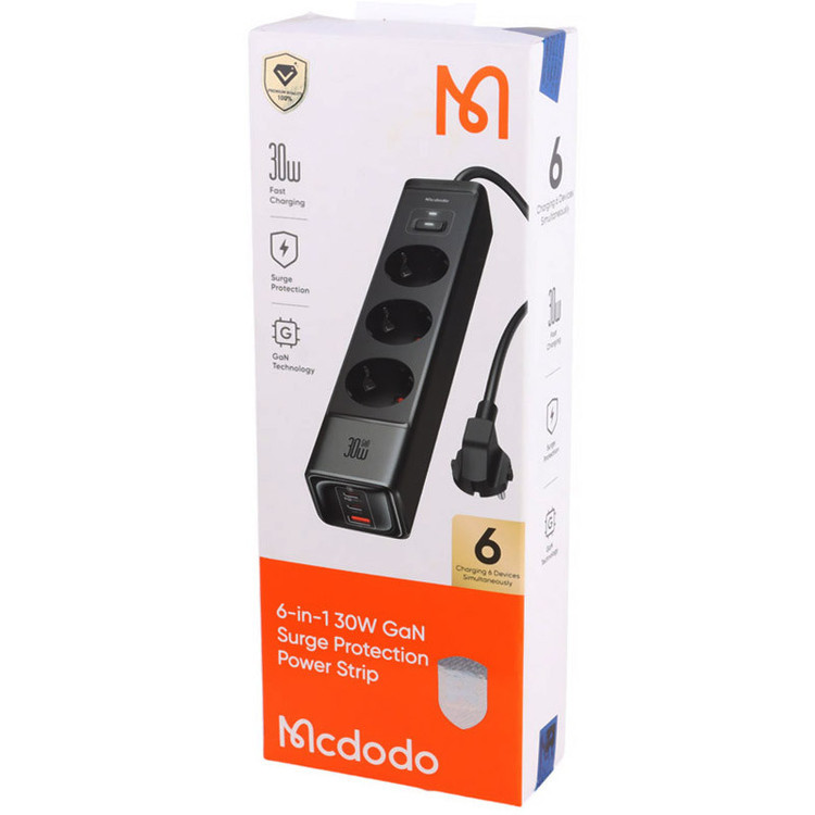 چند راهی برق برند مک دو دو داری ۳ خروجی برق و دو خروجی تایپ سی فست و یک خروجی هوشمند ماکزیمم توان خروجی ۲۵۰۰ وات( با قابلیت تنظیم مقدار شارژ مورد نیاز برای هر دستگاه)