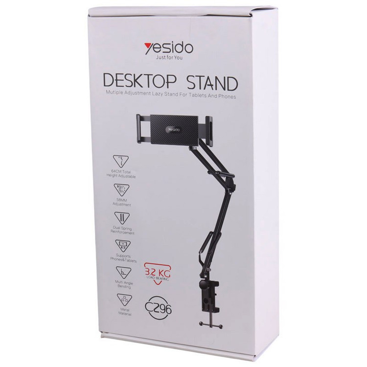 پایه نگهدارنده بازویی موبایل و تبلت یسیدو مدل C296 دارای گیرهی قفل شونده روی لبهی میز و تخت است و در زیر گیرههای آن نیز یک لایه ضدلغزش و ضدسایش قرار گرفته و همچنین مفصل قرار گرفته روی بدنهی آن نیز امکان گرفتن زاویه تا 180 درجه را دارد و بصورت 360 درجه حول محور مرکزی میچرخد. این مفصل دارای یک ضامن است و فقط در صورت رهاسازی ضامن امکان دادن زاویه به آن وجود دارد تا بصورت ناخواسته زاویهی آن تغییر نیابد. همچنین گیرههای این هولدر 680 گرمی نیز به گونهای طراحی شدهاند تا در زمان نصب گوشی یا تبلت، مزاحمتی برای نصب کابل شارژ یا هدفون روی بدنهی دستگاه ایجاد نکنند. پایه نگهدارنده یسیدو مدل C296 از جنس آلومینیوم و پلاستیک مرغوب ساخته شده است.
