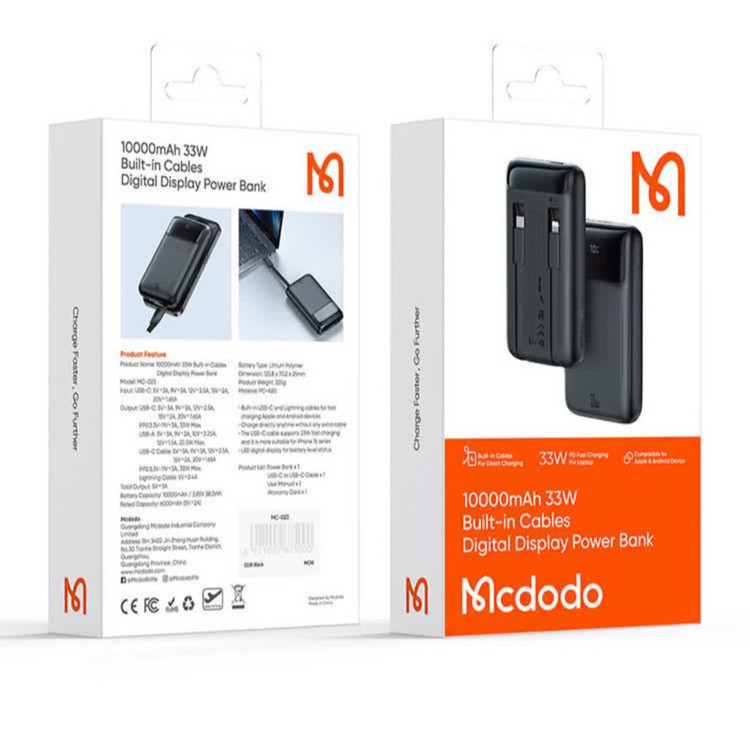 پاوربانک مک دودو مدل MC-023 یک دستگاه جمعوجور و پرقدرت است که با ظرفیت 10000 میلیآمپر ساعت و قابلیتهای متنوعی طراحی شده است. این پاوربانک با پشتیبانی از شارژ سریع 33 وات، امکان شارژ سریع انواع دستگاهها از جمله گوشیهای هوشمند، تبلتها و حتی لپتاپها را فراهم میکند. یکی از ویژگیهای منحصربهفرد این مدل، وجود کابلهای Type-C و Lightning است که به بدنه متصل شدهاند و به کاربران این امکان را میدهند که بدون نیاز به حمل کابلهای اضافی، دستگاههای خود را شارژ کنند. همچنین این پاوربانک قابلیت شارژ چهار دستگاه بهطور همزمان را دارد و از پروتکلهای شارژ سریع PD و PPS پشتیبانی میکند.