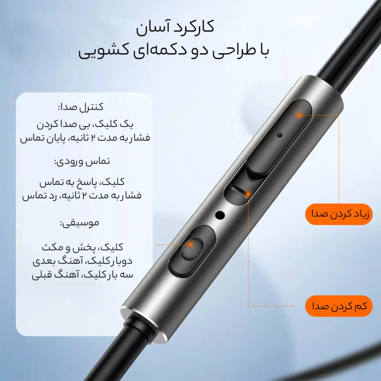 کلید کنترل سیم که روی کابل 1.2 متری قرار گرفته بسیارکاربردی بوده و استفاده از هندزفری را برای شما آسان تر کرده است. کنترل هوشمند 2 دکمه در خط، به صورت کشویی تعبیه شده و برای کار فوقالعاده راحت است.