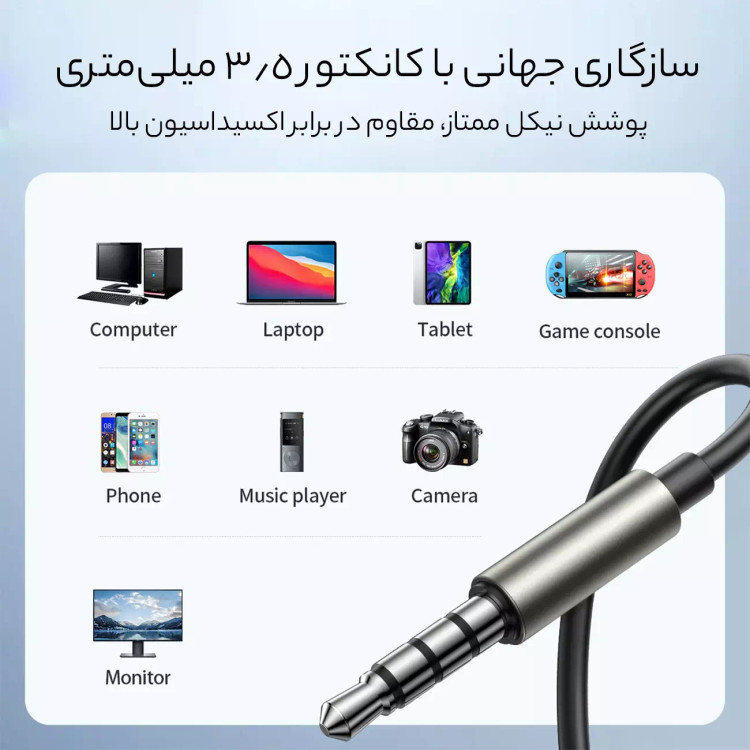 پلاگین نیکل اندود 3.5 میلیمتر جویروم، انتقال پایدار را فراهم کرده و سازگاری گسترده دارد؛ با استفاده از جک 3.5 میلیمتری به موبایل یا هر دستگاهی که دارای درگاه AUX است مانند کامپیوتر، Mp3 پلیر و ... متصل میشود.